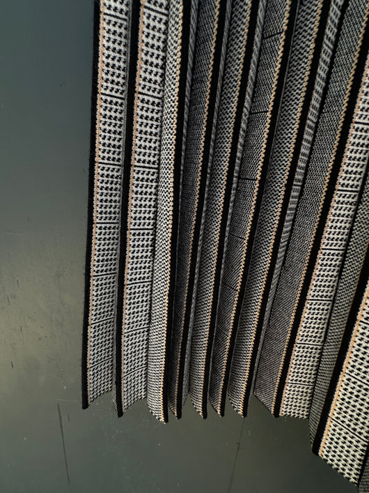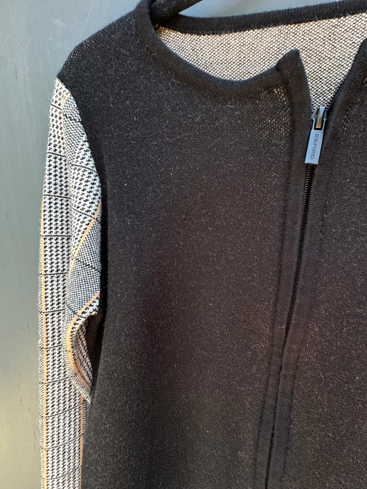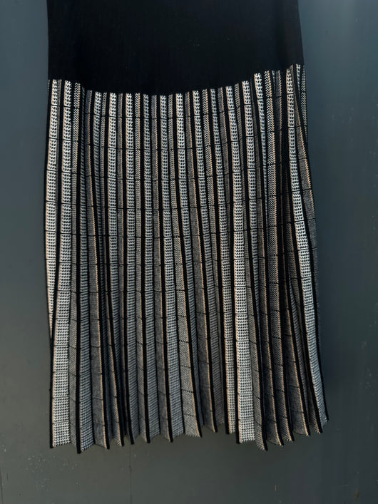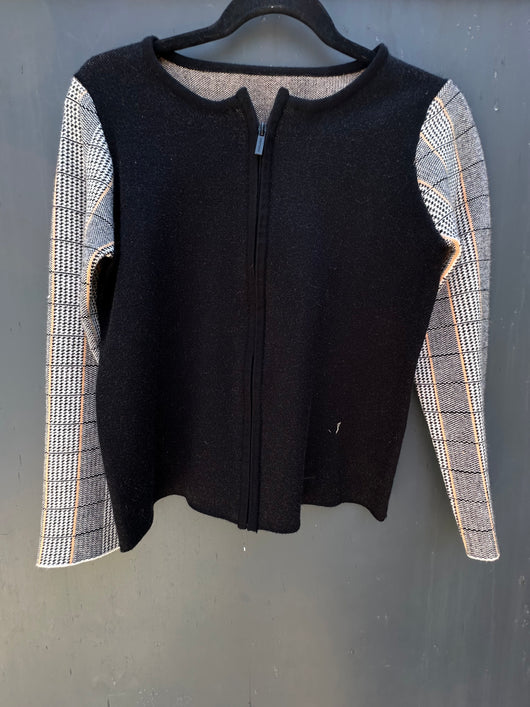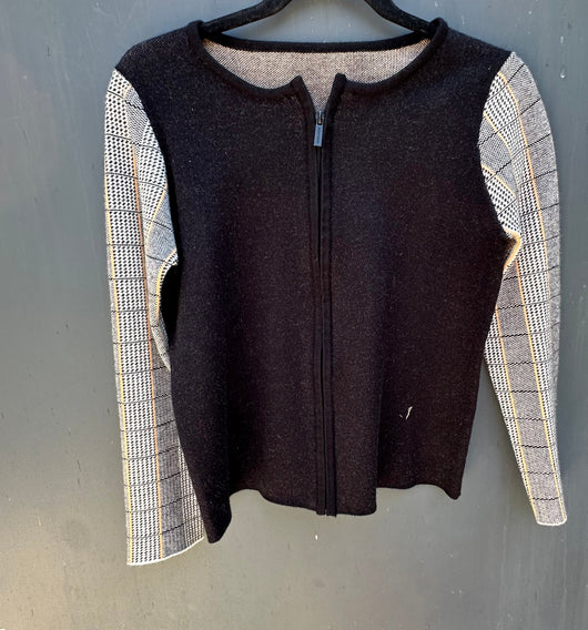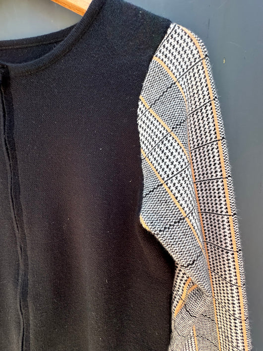 Black sweater jacket with plaid sleeves and matching pleated skirt