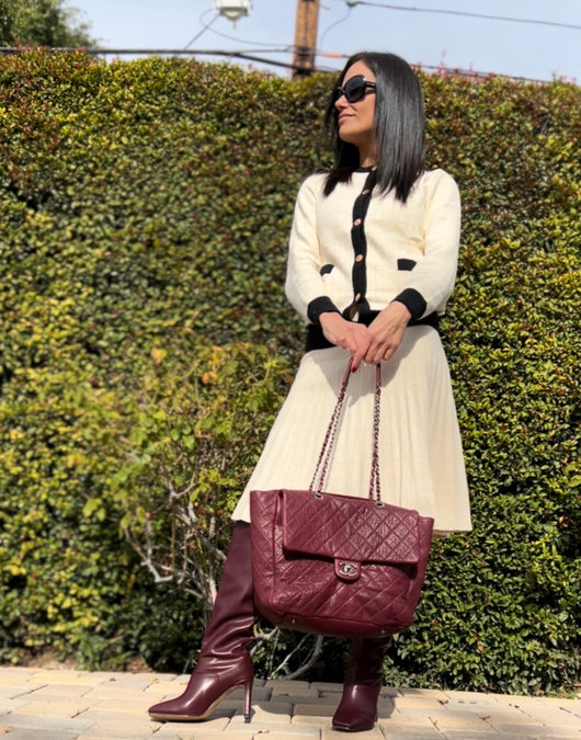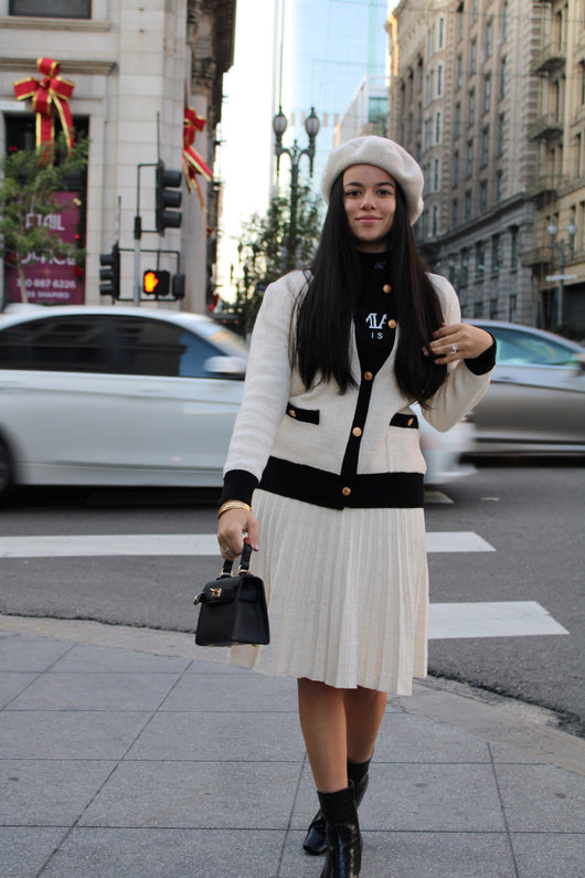 Our gorgeous pleated skirt with w tweed looking knit woven through. The skirt does not have the same elasticity as all our skirts but once pulled on, it will stretch to the body. It can be washed to get back to its original shape, or easily taken in by a professional for those who desire something tighter.