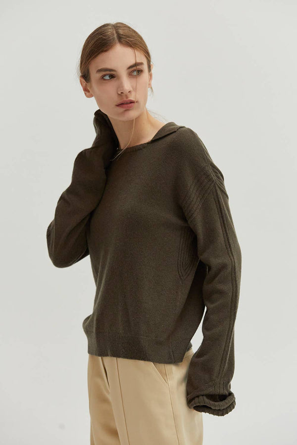 Maline Cashmere Softened Collared Sweater Top SELF: 48% Nylon 27% Viscose 20% Wool 5% Cashmere - Collar on neck - Long sleeve - Ribbed design on armholes and end of...
