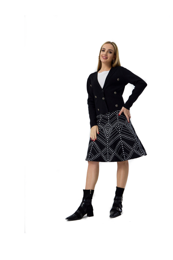 A high quality cotton knit sweater that matches as a set to our Black Tweed Skirt.  Or mix and match with any of our black skirts!! The following is a...