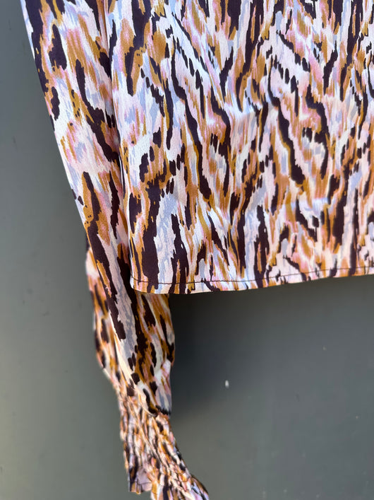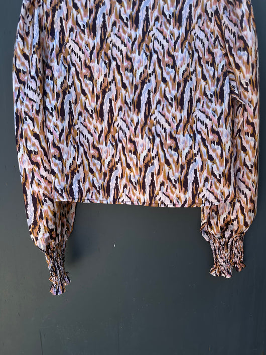 Gorg patterned silky top with smocked sleeves. Crop Style