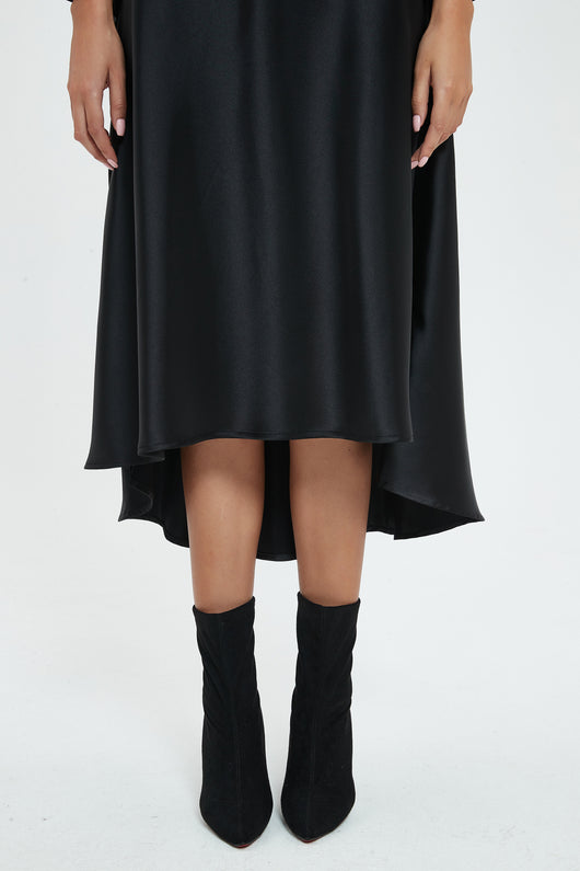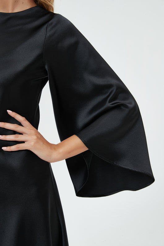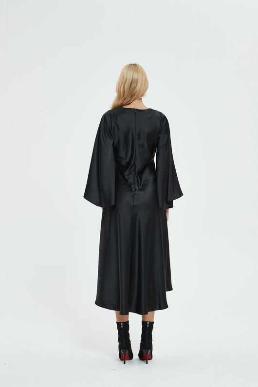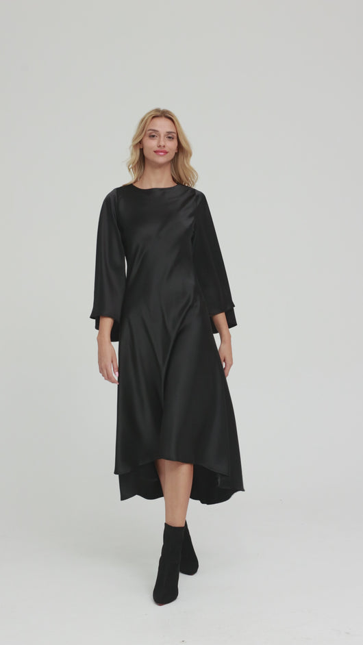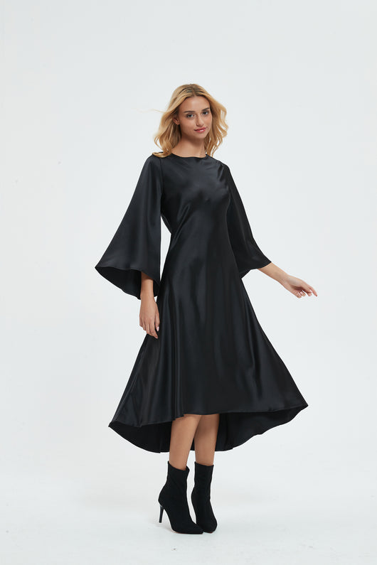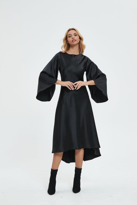 An insanely beautiful dress that comes complete with bell sleeves and a high low hem line. Made of acetate silk with a fit and flare silhouette and zipper enclosure, this dress is a jaw dropper.